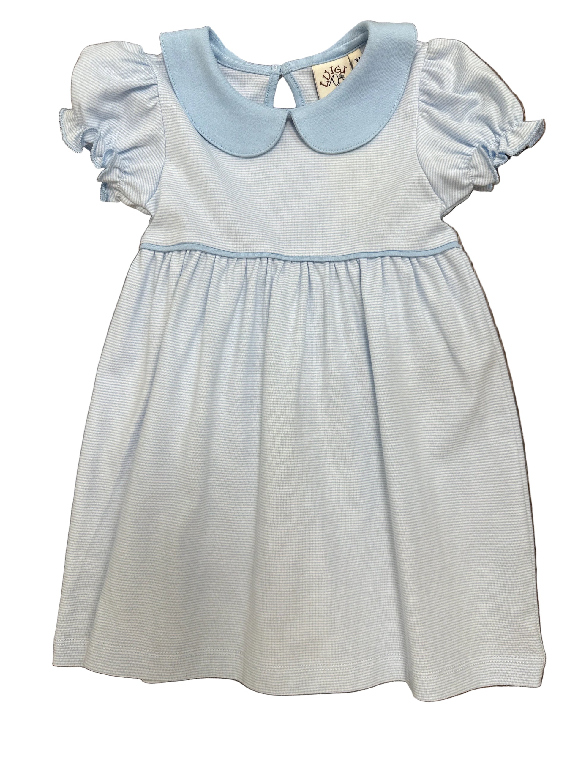 This sweet striped dress is perfect for little ones! Featuring soft baby blue and white stripes, it's made from comfy, breathable fabric with a classic fit that's great for playdates, parties, or sunny days out.