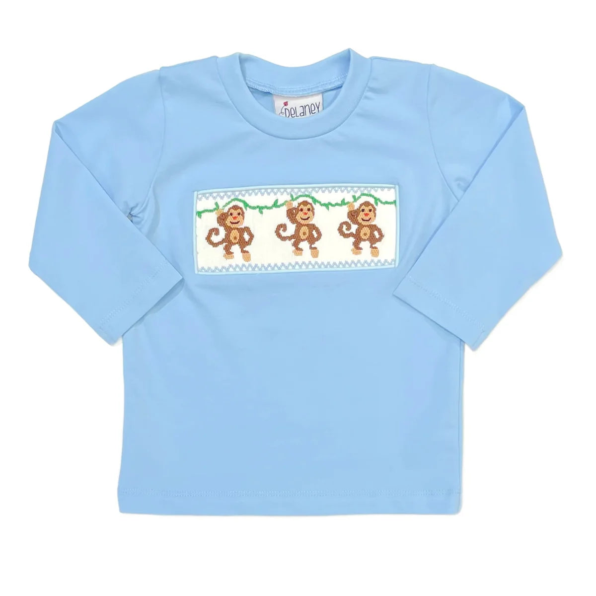 Get ready to monkey around in style with our Blue Monkey Smocked Shirt. Made from soft pima cotton, this long sleeve shirt features playful smocked monkeys. Perfect for toddlers and boys who love a bit of fun!