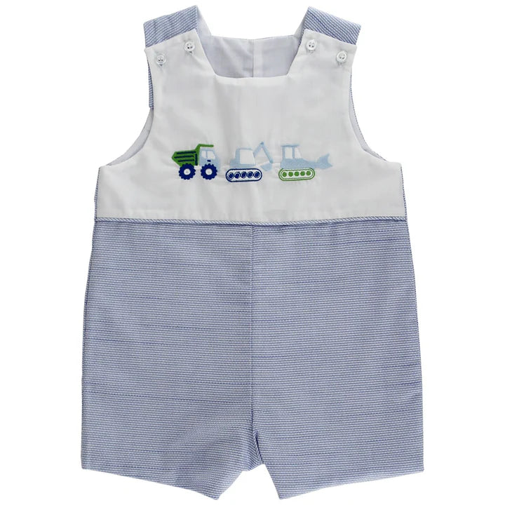 Crafted from premium cotton in a lightweight, breathable fabric, this short John John features an adorable construction vehicle applique front and center — complete with bright, bold detailing that little boys love. Whether he's obsessed with dump trucks, bulldozers, or all things construction, this outfit is sure to spark joy.