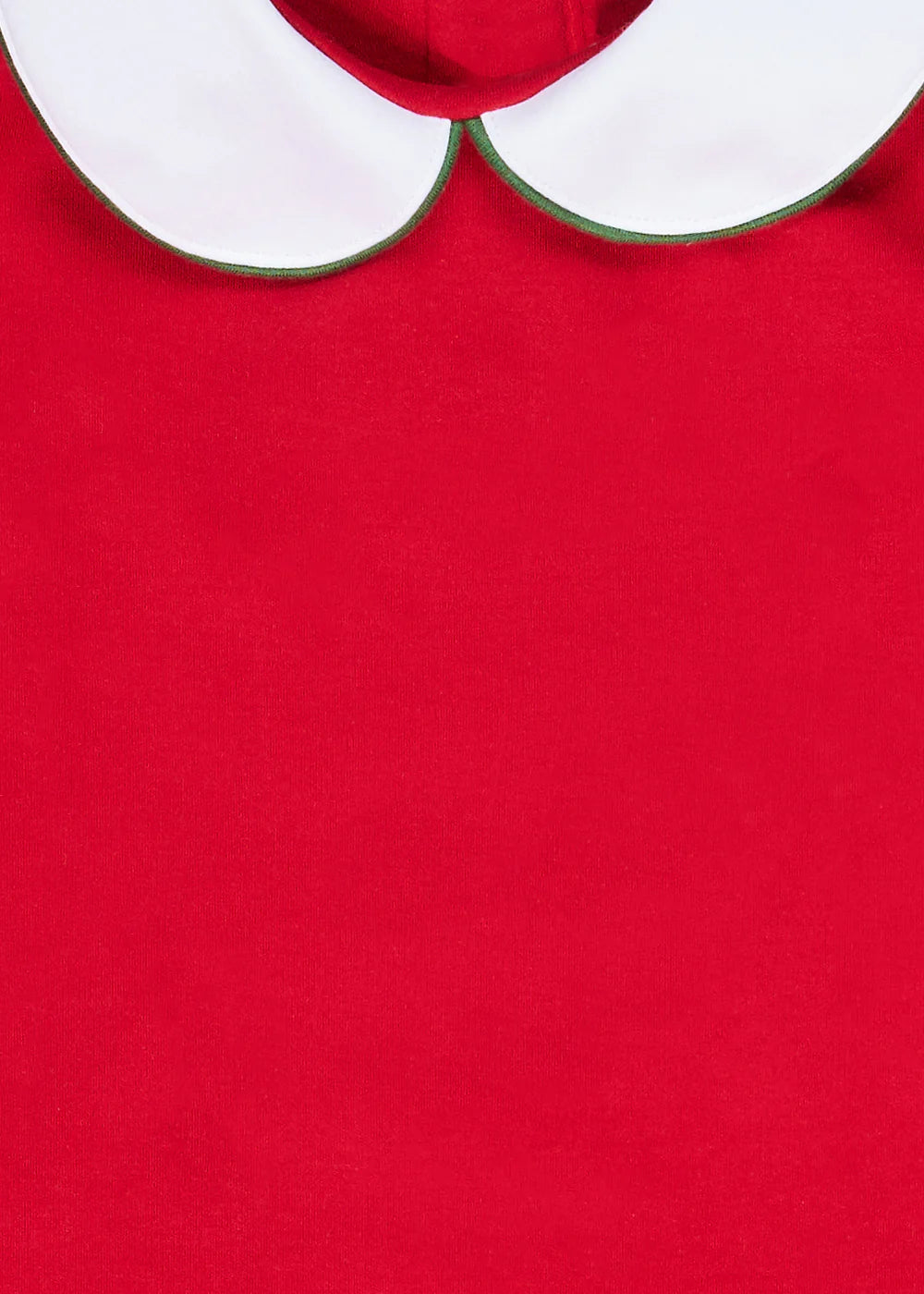 Crafted from luxuriously soft Peruvian Pima cotton, this elegant dress features a bright red hue trimmed in contrasting green piping for a polished, picture-perfect look. The peter pan collar and gathered drop skirt add sweet, thoughtful details that make this style ideal for Christmas celebrations, church services, or family portraits.
