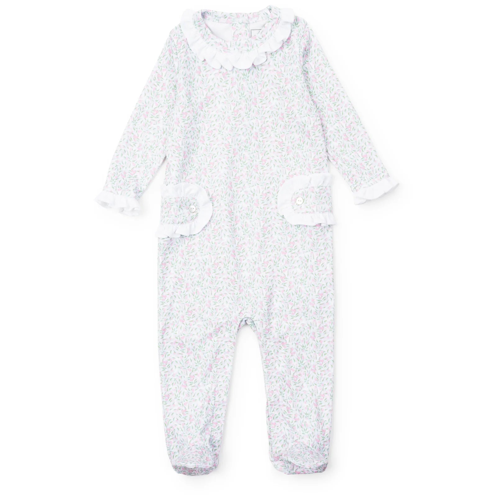 Long sleeved pima cotton footed onesie with ruffles around neck, collar and side plackets. Snaps in stride and back of neck.