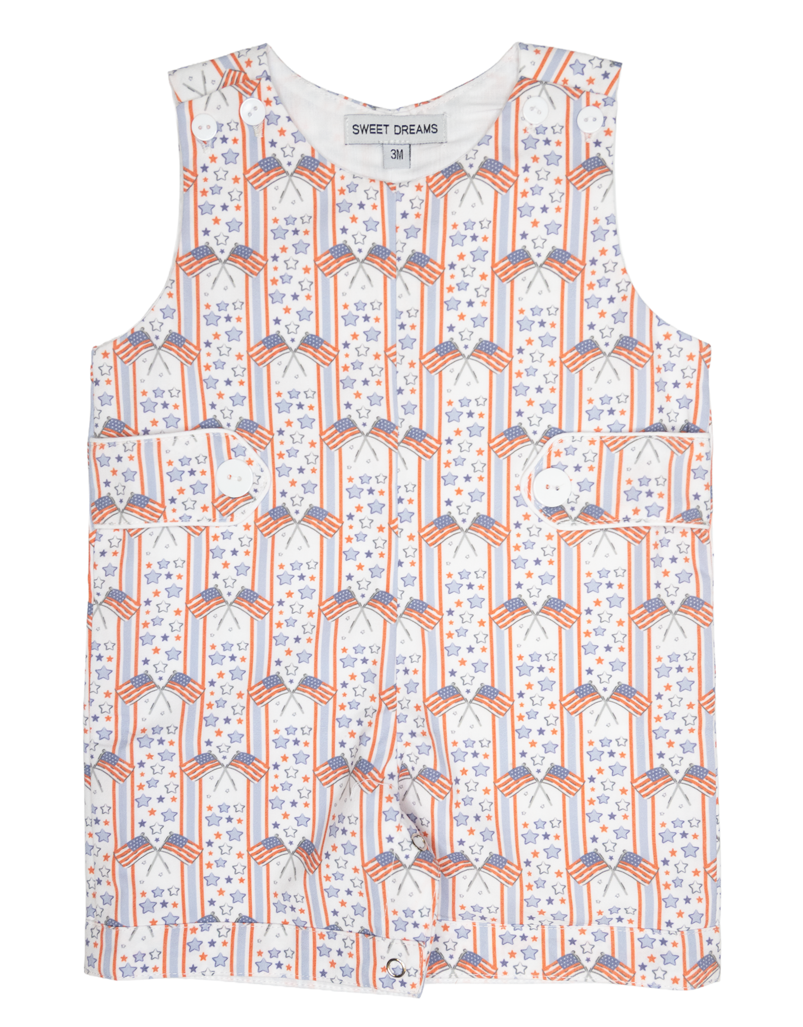 Classic and festive, this patriotic jon jon is perfect for celebrating in style. Featuring a timeless red, white, and blue design, it’s crafted from soft, breathable fabric to keep little ones comfortable all day long. Finished with button shoulders and easy snap closures for quick changes, it’s ideal for summer gatherings, holiday events, and all-American adventures.