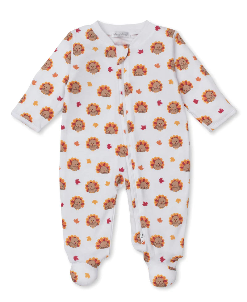 Get baby ready for Thanksgiving cuddles in this Turkey Team Zip Footie. Made from the softest Peruvian Pima cotton, this festive one-piece features a playful turkey -print and a convenient zip-front closure—perfect for cozy comfort from playtime to nap time.
